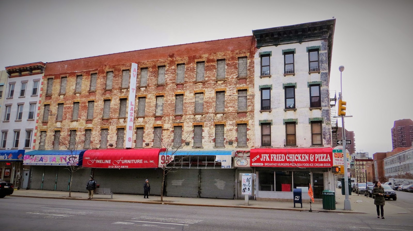 An abandoned building in East Harlem, its windows cemented shut with cinder blocks. This stretch of "Spanish Harlem" isn't as bleak as it looks in this photo, though. Especially when New JFK Fried Chicken & Pizza offers "Breakfast-Burgers-Pizza-Seafood-Ice Cream-Soda." CLICK TO ENLARGE