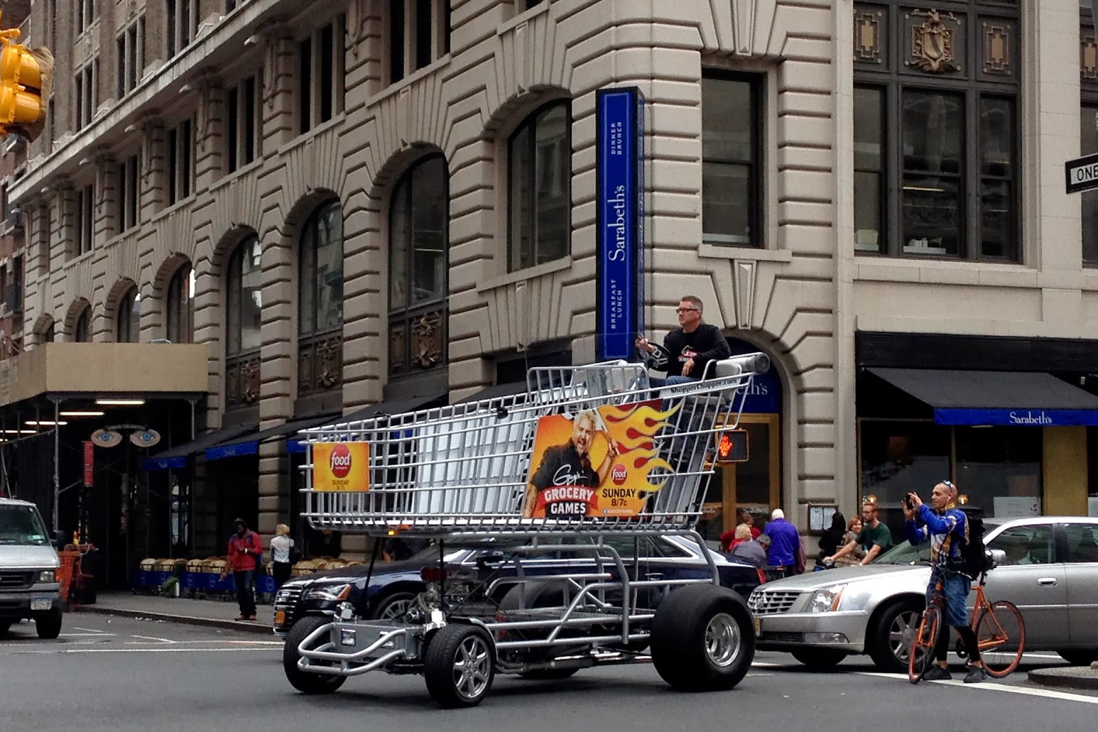 A giant shopping cart with a motor drives down Park Avenue in front of Sarabeth's in the Flatiron neighborhood. The crazy cart is a promotional tool for "Guy's Grocery Games," a Food Network show hosted buy Guy Fieri of "Diners Drive-ins and Dives" fame. Thanks to the lovely and talented @mamamoffa for the photo.