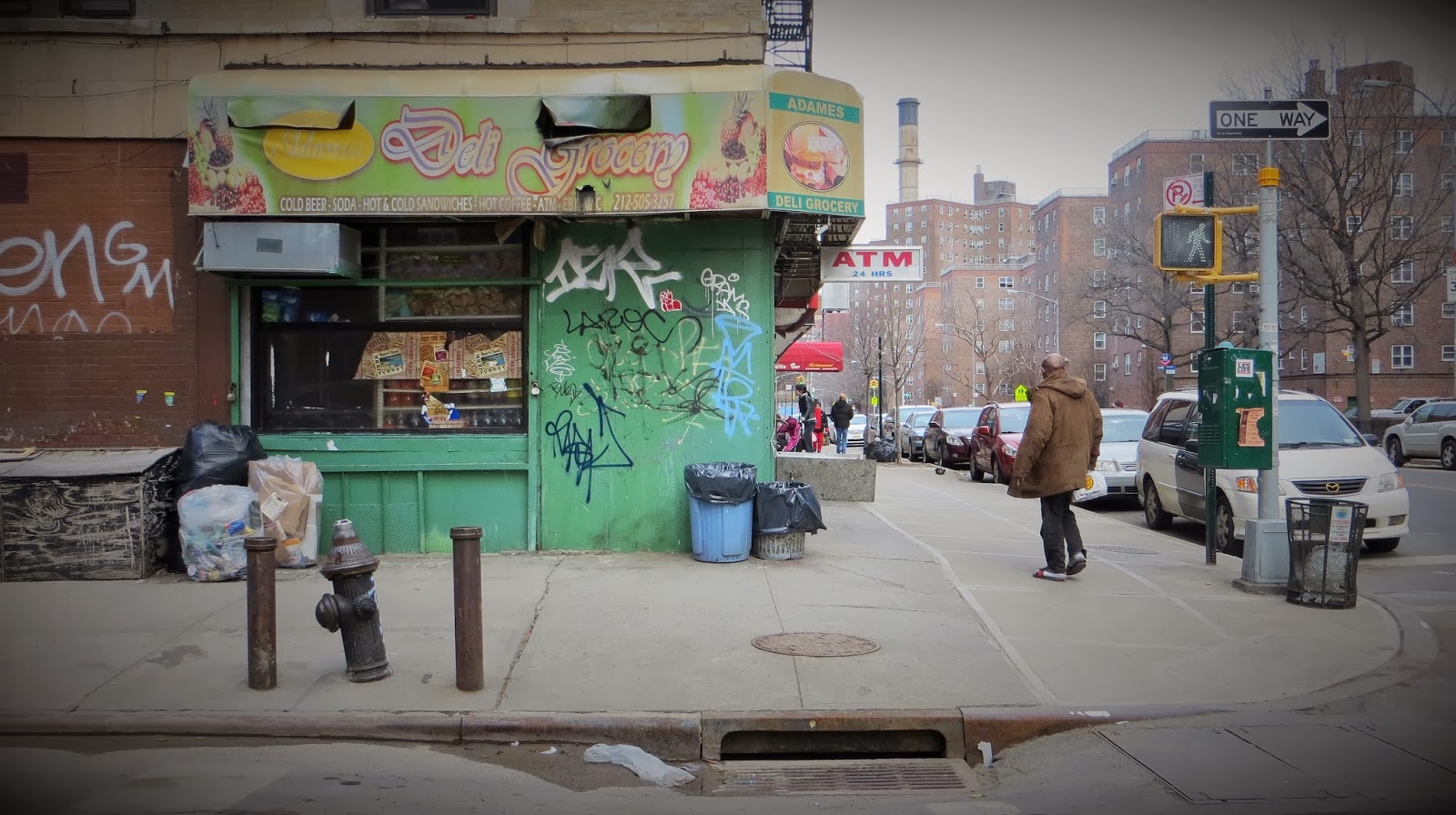 Adames Deli Grocery bodega in the East Village, Alphabet City. In the background: A Con Edison smokestack and the Jacob Riis Houses public housing project. CLICK TO ENLARGE