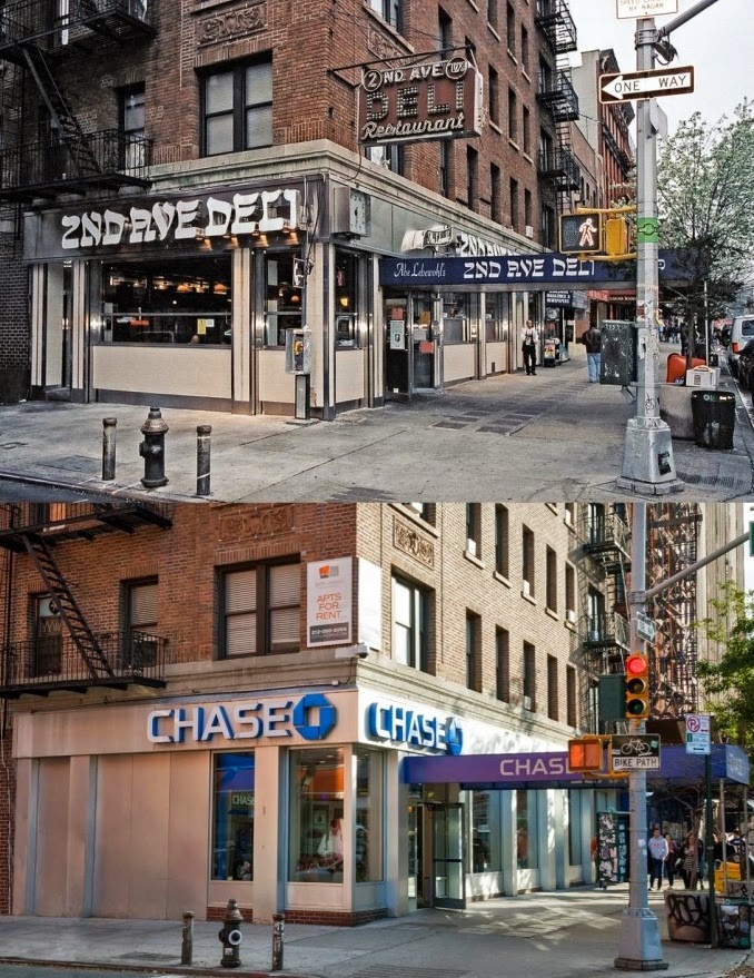 For years, in bookstores, I've always found myself skimming through the amazing photo book, "Store Front: The Disappearing Face of New York," by photographers James and Karla Murray. A decade after publishing the book, the Murrays have gone back to re-photograph the same storefronts to highlight how much they've changed (or, stayed the same) over 10 years. (Original photos are from the early 2000s.) Interestingly, I've always planned on doing the same thing (re-photograph the 'best of' NYC Corners) in five or ten years. Here's are some of James' and Karla's more "corner-friendly" samples...10th St & 2nd Ave, East Village, 2nd Ave Deli